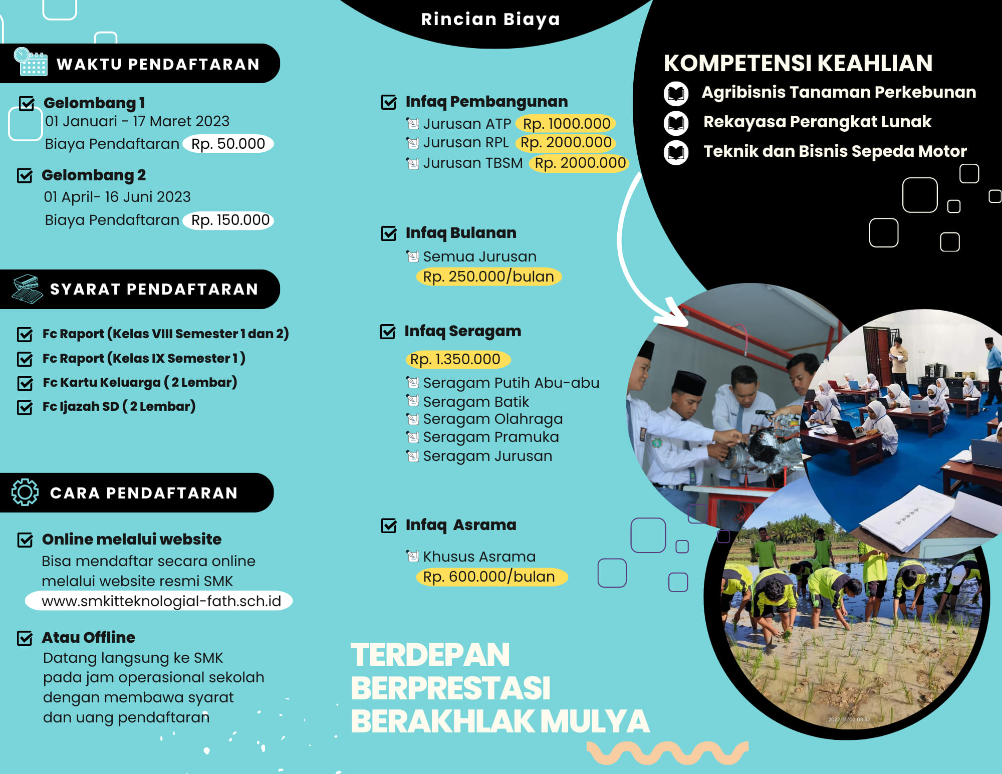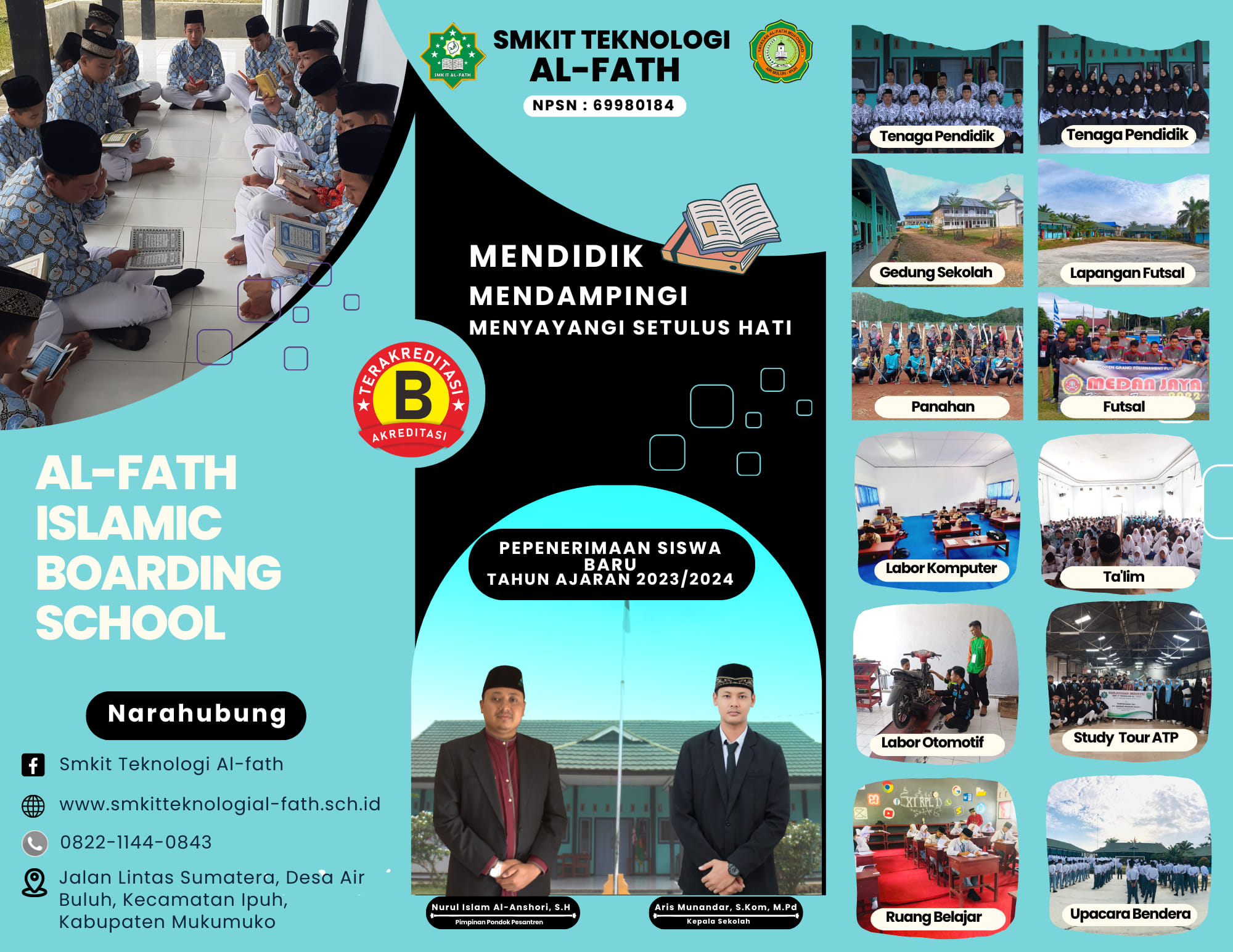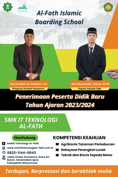 SMK IT TEKNOLOGI AL-FATH adalah sekolah islam berbasis pondok pesantren. Memadukan Kurikulum Nasional dengan Keagamaan, Memiliki Tenaga Pendidik yang berintegritas dan profesional merupakan lulusan kampus negeri dan swasta terakreditasi.